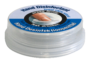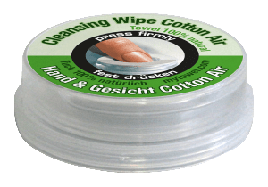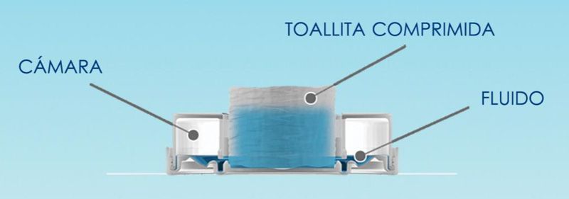 El recipiente (40 mm de diámetro, altura 14 mm) es un sistema de dos cámaras. En la cámara exterior, se lleva a cabo el líquido de aplicación (max.5ml). El centro de la cámara contiene una toallita de celulosa comprimida (23×22 cm). Las dos cámaras están separadas una de la otra.A través de la presión aplicada en el centro, el recipiente se abre en la parte inferior y el líquido de la cámara exterior alcanza el centro de la cámara con la toallita. La toallita entonces absorbe completamente el fluido y se eleva verticalmente. Después de este contacto, la toallita se puede quitar fácilmente, se desenrolla y puesta en uso